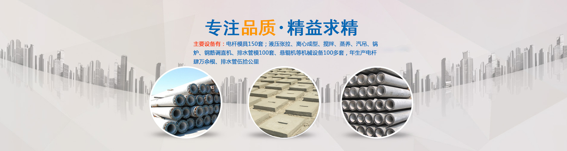 公司主要生產(chǎn)ф100—ф430環(huán)形預(yù)應(yīng)力混凝土電桿和ф190—ф550環(huán)形鋼筋混凝土電桿,以及ф300—ф1000排水管,主要設(shè)備有:電桿模具180套;液壓張拉、離心成型、攪拌、蒸養(yǎng)、汽吊、鍋爐、鋼筋調(diào)直機(jī)、滾焊機(jī)、排水管模100套、懸輥機(jī)等機(jī)械設(shè)備100多套,年生產(chǎn)電桿肆萬余根、排水管伍拾公里?!?